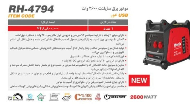 موتور برق بنزینی چهار زمانه سایلنت ۲۶۰۰ وات رونیکس مدل RH-4794