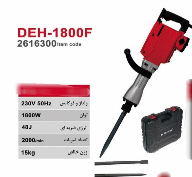 چکش تخریب 15 کیلویی محک از محصولات حرفه ای محک می باشد. مدل این دستگاه DEH-1800F است. به این محصول قلم های شش گوش برای تخریب بتن و زمین متصل می شود.