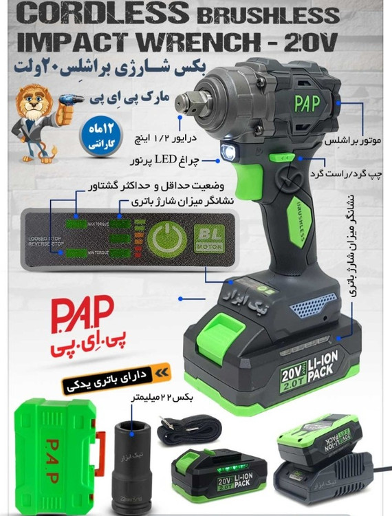 بکس شارژی 20 ولت دو سرعته با کیفیتی بالا تولید شده مطابق اصول ارگونومیک و استاندارد روز مجهز به بدنهای با روکش سلیکونی ضدلغزش دارای دو عدد باتری 20 ولت لیتیومی کشویی 1/5 آمپر تولید شده با دو سرعت ( دو دور ) متفاوت سرعت در حالت اول برابر با 0 الی 2050 دور بر دقیقه سرعت در حالت دوم برابر با 0 الی 2550 دور بر دقیقه نرخ ضربه در حالت اول معادل با 2800 ضربه در دقیقه نرخ ضربه در حالت دوم معادل با 3200 ضربه در دقیقه قابلیت تولید گشتاوری برابر با 350 نیوتن بر متر دارای درایو 1/2 اینچ جهت باز و بست انواع اتصالات امکان کنترل سرعت توسط کلید گازی تعبیه شده مجهز به چراغ LED جهت کار در محیطهای کم نور دارای نمایشگر میزان شارژ باتری جهت مدیریت زمان مجهز به شاسی چپگرد و راستگرد بههمراه دو عدد باتری،شارژر،یک سری بکس و جعبه BMC با وزن بسیار سبک و قابل حمل 1450 گرم