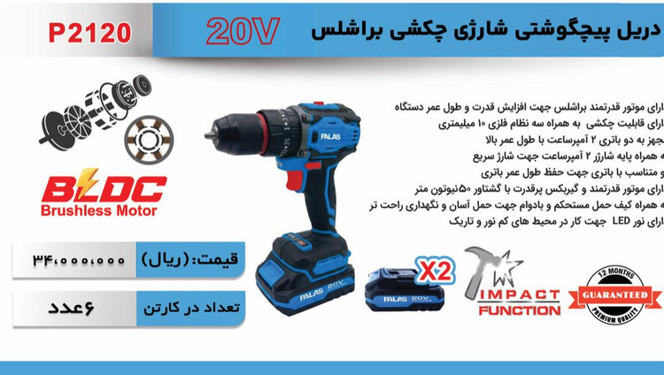 دریل شارژی 20 ولت براشلس چکشی دو باتری پالاس مدل P2120