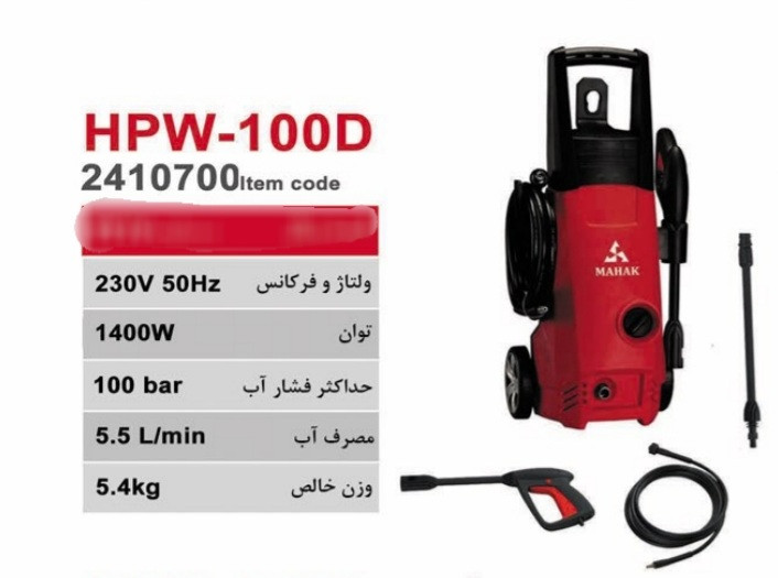 کارواش فشار قوی Mahak مدل HPW-100D دارای موتور قدرتمند ۱۴۰۰ وات میباشد. این کارواش دارای شلنگ فشار قوی به طول ۵ متر است که برای استفاده در مکانهای بزرگ بسیار مناسب است. همچنین داشتن چرخ و دسته حمل و نقل آن را برای کاربر بسیار آسان کردهاست. در این دستگاه میتوان از آب با حداکثر دمای ۴۰ درجه سانتیگراد استفاده کرد. حداکثر فشار آب خروجی این کارواش ۱۰۰ بار است که برای از بین بردن لکههای سخت سطوح بسیار مناسب است.
