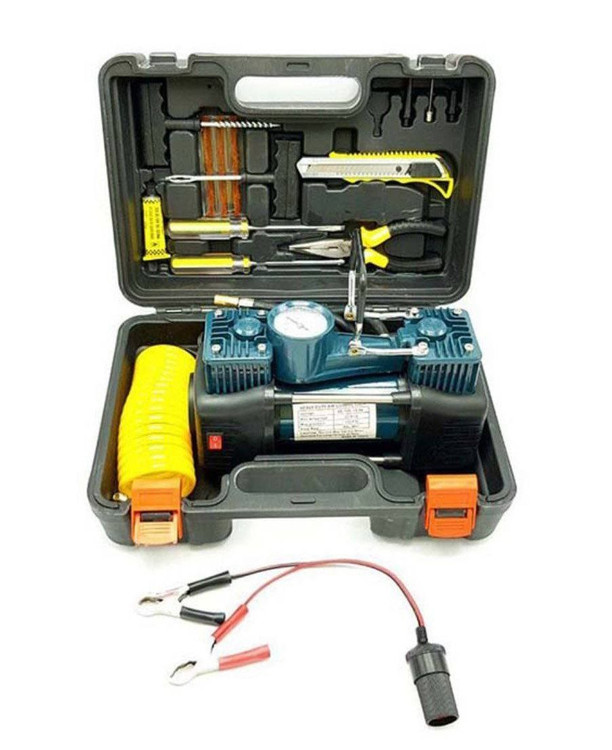 به همراه سه سری نازل باد ، شلنگ فنری ، کاتر ، پیچ گوشتی دوسو ، پیچ گوشتی چهارسو ، دم باریک ، چسب مایع ، ابزار پنچرگیری ، گیره باتری خودرو به همراه کابل ، جعبه مخصوص با قابلیت قرار دادن کلیه متعلقات